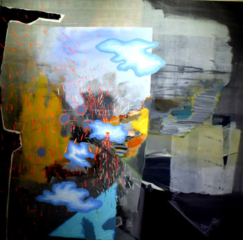 迪?欧利维本次参展的大幅抽象作品《自然景》,大面积灰色调的块面穿插中,似云似雾的深处,崩裂出血色的光点,宛如宇宙爆炸、黑洞抛洒,吸引了许多观众。