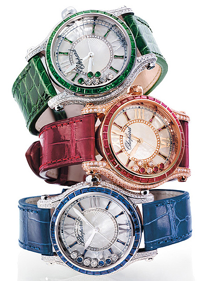 Sport系列极具现代风格,表圈镶嵌长方形切割红宝石、蓝宝石和祖母绿,凸显有力线条。这些宝石还装饰着表盘时标、表冠和凸圆型装饰。鳄鱼皮表带采用艳丽色彩,与妆点腕表的宝石交相辉映。18K白金表壳和珍珠母贝表盘的中央都镶嵌着明亮式切割钻石。另外,著名的“Happy
