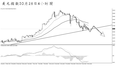 美元指数持续下行挑战趋势线支撑。从日线图上看,价格自高位回落,但上升趋势线和均线系统的依托作用完好,美元指数整体的涨势仍在延续。4小时图MACD显示空头动能仍然略占优势,在跌破趋势线之前,下跌空间相对有限。短线的下行力度有所减弱,美元指数面临一定的反弹需求,但最终选择向下突破继续下调的概率偏大。