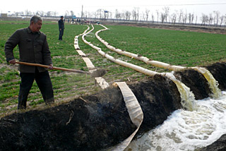 | 3月17日,河北省黄骅市西道安村组织村民抽取地表水浇灌受旱的小麦。今年河北省再次遇到严重春旱,目前,全省受旱耕地已达5000万亩。傅新春