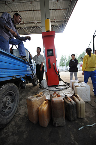 | 几户农民在拿着大大小小的油桶在黑龙江省方正县高号加油站加柴油。本报记者