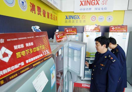 自2008年12月湖南省正式启动家电下乡工程以来,受到了全省农村消费者的青睐,各类家电销售态势良好。目前,湖南省14个市州已经设立了5400家家电下乡销售网点。图为湖南省长沙县路口镇村民正在一家“家电下乡指定店”选购家电产品。新华社记者:龙弘涛
