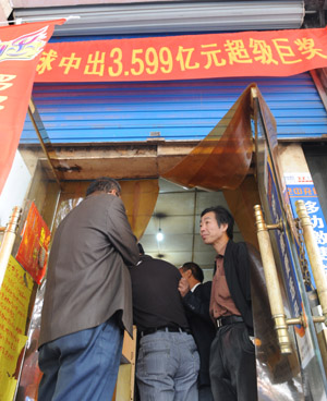 开出3.6亿巨奖的河南安阳这家彩票投注站在门头上悬挂出宣传条幅。这家投注站因为沾了巨额大奖的喜气,生意红红火火,营业额成倍攀升,不少外省市的彩民专程跑到这里购买彩票,期望能够碰上好运气。