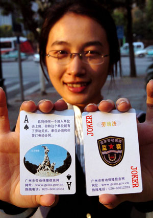 当日起,广东省广州市劳动保障局将印有《劳动法》内容的8万副扑克牌陆续发放给辖区内的农民工。