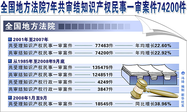全国地方法院7年共审结知识产权民事一审案件74200件