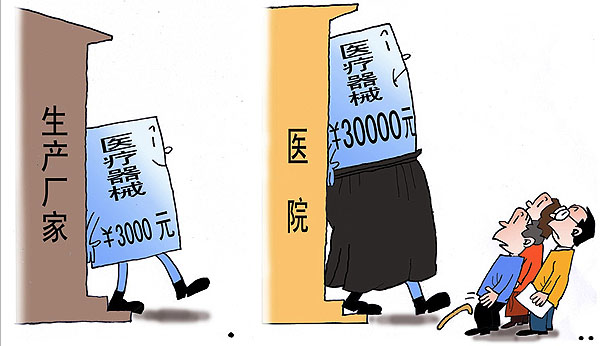 一个国产的心脏支架,出厂价不过3000元,可到了医院便成了2.7万元;一个进口的心脏支架,到岸价不过6000元,到了医院便成了3.8万元。9倍的心脏支架暴利已经超过了贩毒。“医疗器械价格虚高,问题主要不在厂家,他们的利润并不高,虚高的部分都产生于流通环节。”食药监部门相关人员称,医疗器械走出厂门首先要给自己找独家代理商,经过各级代理商才进入医院,这中间至少经过四个环节。新华社发