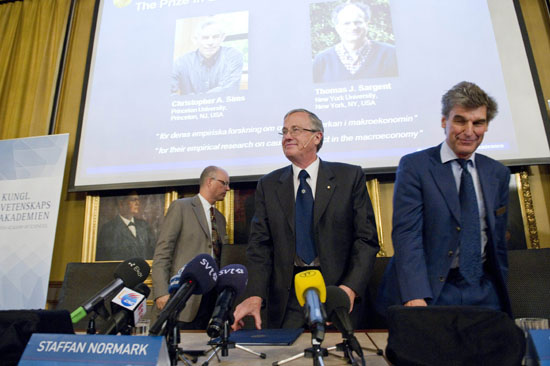 瑞典皇家科学院10日宣布,将2011年诺贝尔经济学奖授予美国经济学家托马斯·萨金特和克里斯托弗·西姆斯。法新社 |