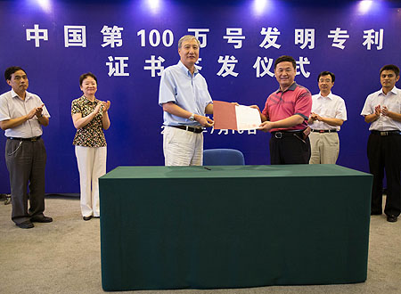 7月16日,国家知识产权局局长田力普(左三)向发明专利权利人北京农业信息技术研究中心的负责人颁发证书。此次签发的第100万号授权发明专利名称为“一种虚拟玉米叶片模型可控面元划分方法”。自1985年授权首件发明专利以来,至今年7月11日,我国27年时间里发明专利累计授权量达到100万件,成为世界上达到这个目标耗时最短的国家。但是,我们的专利拥有总量、国民人均拥有量、专利转化率,还远远落后于许多领先的创新性国家。记者 金立旺 摄 |