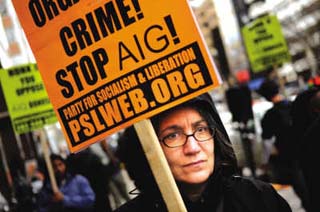 IC图 | 当地时间3月21日,美国康涅狄格州总检察长布卢门撒尔表示,经营陷入困境的美国国际集团(AIG)最近分发的奖金实际不止此前声称的1.65亿美元,而是2.18亿美元。 与此同时,美国各地民众抗议AIG的风潮迭起。图为洛杉矶的抗议者举着“该死的AIG”标牌游行。AIG发放巨额奖金引发美国民众强烈不满。 根据最新资料,有73名美国国际集团的高级员工每人拿到的奖金超过100万美元,其中5人的奖金更是超过400万美元。据报道,布卢门撒尔已要求该公司就此作出解释。 布卢门撒尔说,最新的奖金数据将使民众对美国国际集团行为更加愤怒,因为他们认为这些员工不仅不应该得到奖金,而应该被扫地出门。 美国国际集团是美国金融危机的始作俑者之一,为避免该公司破产从而加剧金融危机,美国政府先后向该公司提供了1700亿美元的救助资金,并控制了美国国际集团80%的股权。但该公司不久前以“履行合约”为由,宣布向员工支付了1.65亿美元的高额奖金,招致美国上下的强烈批评。