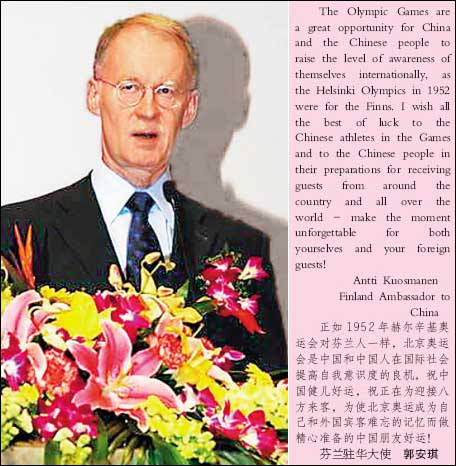 在北京生活只有两年多,可是芬兰驻华大使郭安琪日前接受本报记者专访时却说,在这不长的时间里,他见证了这座城市悄然间发生的巨大变化。“尤其是我们使馆附近朝阳区嘉里中心周围,正在进行大规模的建设,新的央视大楼和世贸中心第三期楼群即将竣工,它们将成为我们身边新的风景。这快速的发展当然与即将举办奥运会有关,也因北京和整个中国正处于快速发展的时期。”郭安琪大使说。