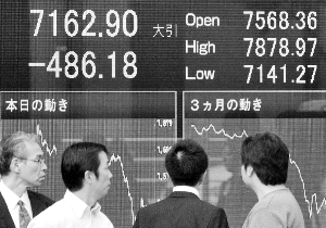 前一天暴跌9.6%的日本股市27日再遭重挫,股指大跌逾6%,收在26年来最低点。截至27日收盘,日经225指数跌486.18点,跌幅达6.4%,报7162.90点,为1982年10月7日以来最低收盘价。上周五,该指数暴跌9.6%,至五年半低点。 个股中,大型银行股成为下跌主力。上周末有报道称,日本几大银行正在考虑采取战略性举措来补充资本金。这些措施可能会稀释现有股权,因而引发了更多抛售。 三菱日联金融收盘狂泻15%,至上市以来新低。瑞穗金融集团跌15%,三井住友金融跌12%。在三大银行大跌拖累下,东证指数银行分类指数当天收跌12.5%。 尽管日本经济增长放缓,但日本的金融体系迄今为止并未受到金融危机最严重冲击,该国的银行业也并未爆发大型破产事件。但是,连续跳水的股市却正在给日本的银行带来压力,本月以来,日股市值已损失三分之一,可能成为有史以来损失最惨重的一个月。 日本媒体周末披露,股市暴跌不可避免地给金融机构带来了巨大投资损失,为此,三菱日联、瑞穗金融和三井住友三大银行正在寻求巨额融资。 报道称,日本最大银行三菱日联可能需要融资1万亿日元(108亿美元)以充实资本;而紧随其后的瑞穗金融和三井住友则可能各自寻求融资5000亿日元(54亿美元)。