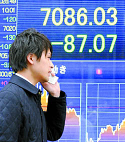 | 9日,日经指数收低1.2%,触及26年来收盘低位。传真图 | 昨天(3月9日)亚洲和欧洲市场再度涌现的一波抛售狂潮,使得全球主要股市纷纷陷入“熊市中的熊市”。因为即便只从今年开年算起,全球股市也已跌入了技术上的熊市,即自年初高点累计回调20%。 经过上周的连续大跌,美国三大股指以及欧洲主要股指年内跌幅已经超过两成。而在昨天,随着亚太和欧洲股市的又一轮暴跌,不少亚洲股市年内跌幅亦超过20%,日本等股市甚至跌至26年新低。