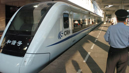 4月18日,中国铁路第六次提速启动,11组65对D字头列车行驶在广深线上,其中直达D字头列车7对,全程仅需52分钟。广州至深圳每天有85趟列车以每十分钟一趟的频率营运,使这两个相距147公里的城市真正进入一小时生活圈。图为在广州火车东站,一列“和谐号”高速列车准备出发开往深圳。
