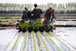 5月13日,在位于黑龙江省富锦市的创业农场,几位农民在用插秧机插秧。