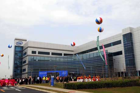 这是4月28日拍摄的英特尔大连芯片厂综合办公大楼落成典礼现场。 当日,英特尔大连芯片厂(FAB68)综合办公大楼在辽宁大连开发区投入使用。英特尔大连芯片厂是英特尔公司在全球的第8个、亚洲的第1个300毫米晶圆厂,投资总额达到25亿美元,按计划将于2010年正式投产。这个厂的总使用面积达16.3万平方米,内含1.5万平方米的无尘室,计划采用英特尔最先进的纳米制程工艺,并配合全球主流的300毫米晶圆技术,成为英特尔在全球芯片生产网络的重要组成部分。