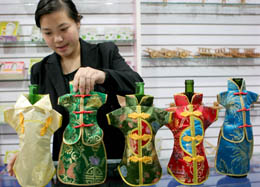 以手工盘扣及织锦缎面料制作的中式服装酒套,受到许多消费者的喜爱。图为安徽淮北一家商店的工作人员在给酒瓶套上“中式服装”。