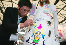 2006中国国际文具及办公用品展览会日前在上海开幕。来自中国、奥地利、比利时、法国、德国等22个国家和地区的500余家企业参展。图为一位工作人员展示可以在衣服上进行彩绘的专用笔。