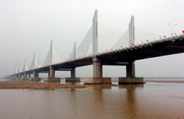 11月28日,大(庆)广(州)高速公路河南段标志性建筑——开封黄河大桥建成通车。 开封黄河大桥于2004年9月开工建设,总投资约20亿元,全长7.8公里,主桥长1010米,桥宽37.4米。图为建成通车的开封黄河大桥。