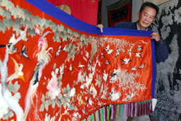 云南昆明74岁高龄的民间刺绣收藏家张龙元先生收藏滇南清代、民国刺绣50余年,绣品累计已达2100多件,并建立起自己的“刺绣博物馆”。图为张龙元老人在他的“刺绣博物馆”里展示他收藏的大贡桌围百鸟朝凤。
