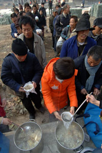 12月10日,一些流浪者在领取食物。 陕西省西安市有一支专门为流浪者提供衣食的志愿者队伍,被人们亲切地称为“慈善厨房”。志愿者队伍由英国人托尼发起并出资,人员大多为在互联网上招募的大学生和西安市民。每个周三的晚上和周日的中午,这些志愿者先在固定地点为流浪者分发食物和衣服,然后深入到西安钟楼附近的闹市区主动寻找流浪者,为他们提供衣服,用爱心向流浪者传达一种互相帮助的理念。到目前为止,“慈善厨房”活动开展已近一年,共有237人轮流参加志愿活动,受到他们帮助的流浪者达4000人次。