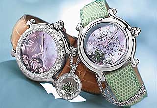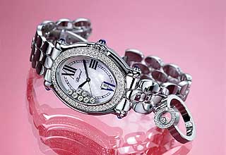 Diamonds)”。在表盘上,活动的钻石在两块透明的蓝宝石水晶之间可以完全自由地滑动和转动。随着手腕的动作,钻石不停地游走,闪烁出星星点点的诱人光芒。萧邦表“快乐钻石”系列被视为风格独特的表中极品,它改变了宝石仅能静态镶于表面的设计,赢得了1976年德国巴登巴登金玫瑰奖。自此,萧邦公司跻身国际顶级豪华表制造商之列。