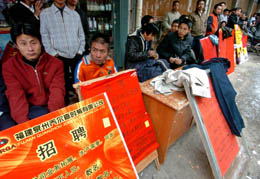 春节过后,记者在福建民营企业发达、用工集中的泉州地区采访发现,不少企业遇到招工难问题。据了解,泉州地区共需外来工约200多万人,但目前大多数企业缺工率在20%至30%。图为石狮市许多企业在街边排起招工摊位长龙。