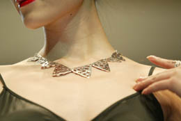 图片说明:上海国际首饰时尚节上展出的珠宝首饰。依次为:蛇形铂金手镯、银质项链、金制工艺手镯和工艺项链。(本报资料照片) |