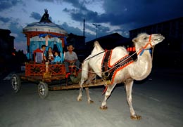 游人坐着骆驼车在呼伦贝尔市的海拉尔街头游览。本报记者:任军川 摄