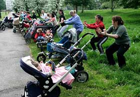 据美国洛杉矶媒体报道,北美不少新妈妈在参加“手推车快步走”活动,她们一起带着宝宝适当运动,据说这对恢复身材、树立信心非常有效。 当新生命降临的喜悦和热闹过后,很多初为人母的女性不得不面对身材走样、与社会联系减少等烦恼。洛杉矶新近出现的“手推车快步走”培训班正是为了鼓励新妈妈带着宝宝走出家门,恢复美好身材,告别沮丧心情。 据报道,美国和加拿大已有184家这样的培训班,学员超过两万名。参加培训班每个月的费用在50美元到75美元之间。新妈妈每次运动一个小时左右,最后用5到10分钟放松,运动结束后还可以相约一起购物或聊天。 31岁的乔治娅·米切尔是培训班的教练。她说,六周大的宝宝就可以陪着妈妈训练,妈妈们可根据自己的情况选择不同等级的课程,所有教练都是有专业资格认证的年轻妈妈。 通常,新妈妈们不愿意为了健身而把孩子交给保姆,“手推车快步走”正好可以让妈妈带着宝宝锻炼。因为经历相似、年龄相仿,年轻妈妈们在一起会非常开心,很多产后在家里闷出抑郁症的妈妈们因此得到了释放。而且,妈妈运动的时候和宝宝有很多互动,小家伙们往往很兴奋,不会产生被遗忘、被忽略的感觉。