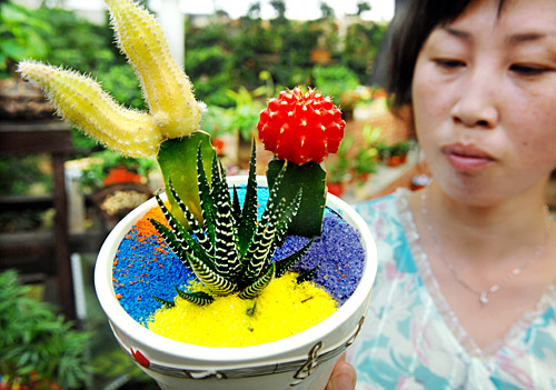 一位女士正在观看一款铺垫着彩砂的盆栽。近日,银川花市上出现了一种铺垫着彩色砂土和石子的盆栽植物,艳丽的彩色砂石为原本单调的绿色观叶植物增添了别样色彩。