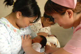 摄) | 每年8月的第一周是“世界母乳喂养周”,在许多医院的妇产科诊室、走廊里,“母乳喂养好”一类的标语或宣传板都被挂在了显著位置,而且这一观念已经深入“准妈妈”们的心里,并准备付诸行动。但与此同时,工作繁忙、经验不足、护理不当等种种因素也在困扰着新一代母亲,使她们想实现纯母乳哺育下一代的愿望难成现实。 妇产科专家分析说,目前大部分婴儿都是用母乳和配方奶粉进行混合喂养,实现纯母乳喂养的比例很小。这其中固然有许多客观原因,但与产妇自己的一些习惯和护理方式不当也有直接关系。