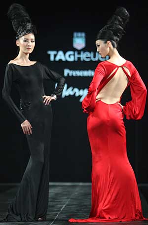 图为模特在北京明城墙遗址公园展示马艳丽专为豪雅表时尚盛宴设计的时装。