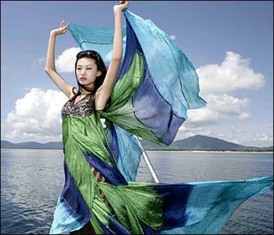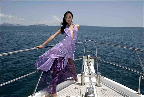 获得2007年新丝路中国模特大赛奖项的选手在海南三亚一艘游艇上展示时装设计师张义超的时装作品。