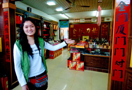 厦门大嶝对台小额商品交易市场自实行进一步放宽免税商品购买额度政策以来,客流量和商品交易量迅速增长,市场呈现出欣欣向荣的景象。今年1至11月中旬,前来这里购物旅游的人数已达80多万人次,商品交易额达1200多万美元。图为经营金门三宝(贡糖、菜刀、高粱酒)的业主在商店门前热情招引顾客。