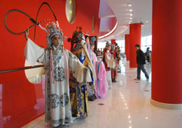 11月23日,从属于中国京剧院的梅兰芳大剧院举行落成开业庆典活动,一尊梅兰芳铜像安放在梅兰芳大剧院大厅正中。图为观众在梅兰芳大剧院的京剧艺术展示大厅内欣赏京剧人物造型。