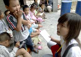一名社工在给留守儿童们朗诵诗歌。新华社记者:岳月伟