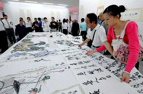 5月16日,观众在“两马”书画摄影作品展上欣赏书画作品。当日,福州马尾和马祖联合举办的“两马”艺术家书画和摄影作品联展在福州画院举行,展出的“两马”艺术家数百幅书画摄影作品吸引了众多观众。