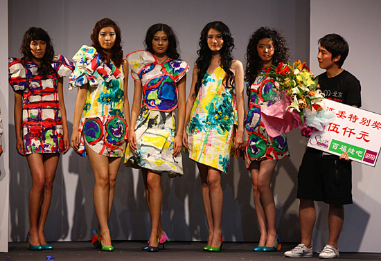 日前,ESMOD·北京高级时装设计学院2008年学生毕业作品展演在北京举行。图为模特们在展示毕业生作品。