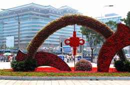 安放在西单附近的一座立体花坛雕塑《中国结》。随着奥运会开幕日期的临近,北京市长安街的道路两旁陆续增添了许多造型独特、寓意深刻的花坛雕塑,姹紫嫣红的鲜花把这条“首都第一景观大道”装点得格外诱人、靓丽。