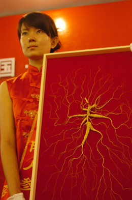 日前,在吉林省长春市举办的2008中国·吉林国际人参大会“长白山参王”拍卖会上,一棵有百年参龄的长白山“野山参王”,以86万元高价拍卖成功,成为野山参的“王中之王”。 据负责本次拍卖会的吉林省宏大拍卖有限公司工作人员介绍,这棵人参于今年8月3日在长白山脚下、蛟河漂河川附近出土,参龄达百年以上,鲜重85克,干重25克,且五形俱美,纹少而清晰,腿须呈人字完美展向四周,犹如“仙光四射”,故得名为“千手观音”。 在拍卖会上,这棵“千手观音野山参王”的起价最高,为30万元。在几位买家的激烈竞拍下,价格节节攀升,最后以86万元高价竞拍成功。一位不愿透露姓名的买家介绍,野山参药用价值极高且具备很高的收藏价值:“野山参是稀有物种,会越来越稀少,很珍贵,所以要买来收藏。”这位买家在拍卖会上以58万元也拍得一棵百年“野山参王”。 吉林长白山参王拍卖会迄今已经成功举办了三届。长白山区是中国乃至世界人参主产区,产量分别占全国的80%和世界的70%,人参出口占世界出口量的60%以上。