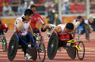 9月9日,中国选手张立新(左)与队友李虎召在比赛中交接。当日,在国家体育场进行的北京2008年残奥会男子4X100米接力T53/T54级决赛中,中国队以49秒90的成绩夺冠。