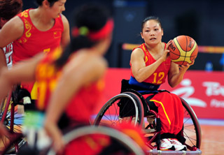 9月9日,中国队球员刘咪换(右一)在比赛中控球。当日,在国家体育馆举行的北京2008年残奥会轮椅篮球女子B组预赛中,中国队以53比37战胜墨西哥队。
