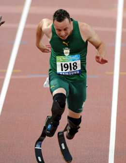9月9日,南非选手皮斯托瑞斯在比赛中冲过终点。当日,在国家体育场进行的北京2008年残奥会男子100米T44级决赛中,有“刀锋战士”之称的南非著名残疾人运动员皮斯托瑞斯以11秒17的成绩夺得冠军。