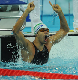 9月9日,巴西选手布拉西尔在获胜后庆祝。当日,在北京2008年残奥会S10级男子100米自由泳决赛中,巴西选手安德烈·布拉西尔以51秒38的成绩打破世界纪录并获得冠军。