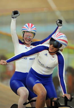 9月9日,英国选手麦格林(左)和领骑员亨特在比赛后庆祝胜利。当日,在老山自行车馆举行的北京2008年残奥会场地自行车女子个人追逐赛(B&VI)中,麦格林和亨特以3分39秒809的成绩夺得冠军。
