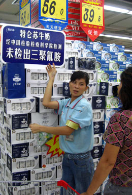 9月24日,在海口某超市,蒙牛牛奶推出优惠活动,并标出牛奶不含三聚氰胺的标志。目前,蒙牛、伊利等奶制品商家都在海口市各大超市贴出公告,承诺目前所售产品已通过检验,市民可放心饮用。鉴于消费者对商品的信心还有待恢复,部分商家积极开展了各类促销活动。