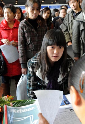 11月20日,毕业生在与用人单位代表洽谈。 当日,“江苏省暨南京市2009届普通高校毕业生公益供需洽谈会”在南京国际展览中心举行,近千家用人单位为毕业生提供有效需求职位四万多个,参会用人单位及数万应聘毕业生均免费入场。江苏省2009年高校毕业生总数将达45.8万人,比2008年增加约3万人,毕业生人数再创历史新高。