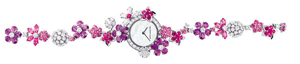 Folie des Prés系列是梵克雅宝(Van Cleef &Arpels)向大自然的致敬之作。对比色加上简单的线条和多样的形状,呈现出花朵生动轻盈的特质。系列中,各种花朵的图案被精心设计成不对称的排列,使小野花的生长更为茂盛,散发出自然气息。不仅如此,每片花瓣都镶有一颗宝石:圆形钻石、梨形或马眼形的半宝石均经精心切割,以迎合花瓣的形状。(资料照片)