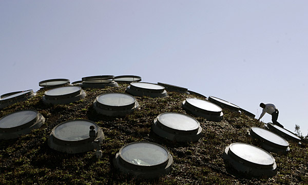 在美国加利福尼亚州的旧金山市,一名工人爬上科学研究院的“活屋顶”,所谓“活屋顶”便是在现代建筑的顶部种草以增加绿植覆盖,减少温室气体。新华社发 |