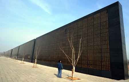 2月26日,一位年轻人在看地震纪念墙上的祭文。日前,河北省唐山市政府为更好地保护地震遗址,同时给广大市民提供一个祭祀地震罹难者的场所,在建设中“唐山市地震遗址纪念公园”中建造的一座长约300多米,镌刻上祭文和24万罹难者姓名的地震纪念墙即将竣工。 1976年7月28日,河北唐山发生里氏7.8级地震,造成24万人遇难。